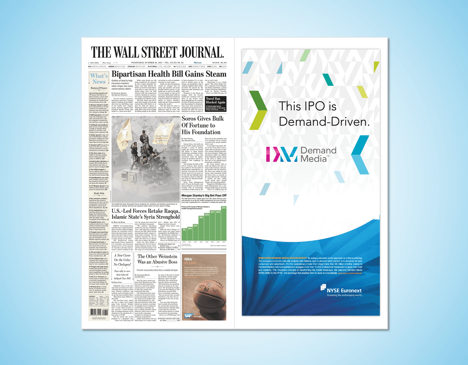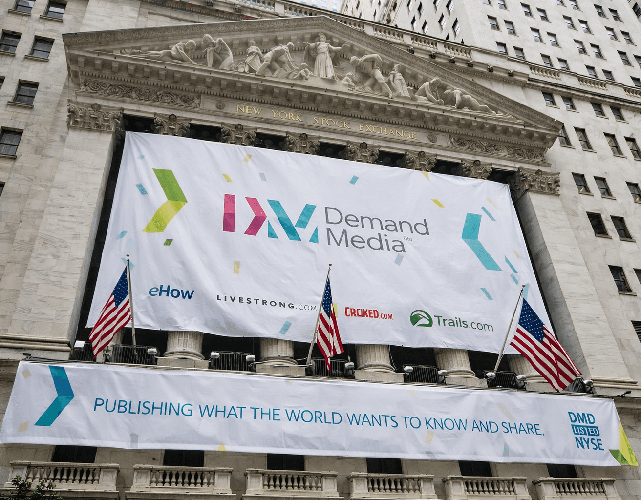 I then led the marketing partnership with NYSE to transform listing day into a large-scale brand activation—negotiating creative placements across NYSE's owned channels, draping the iconic facade with Demand Media and its family of brands, dominating Times Square digital signage, and securing branded placements in airports. What's typically a ceremonial bell-ringing became millions of earned impressions in a single week.